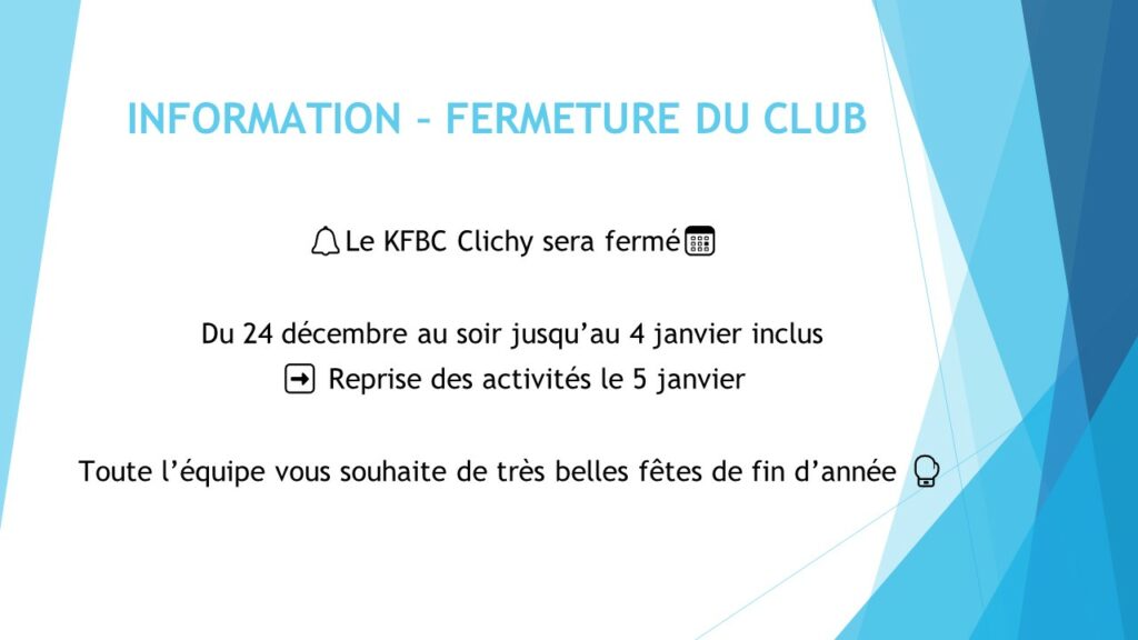 🔔Le KFBC Clichy sera fermé📅 du 24 décembre au soir jusqu’au 4 janvier inclus ➡️ Reprise des activités le 5 janvier Toute l’équipe vous souhaite de très belles fêtes de fin d’année 🎄🥊
